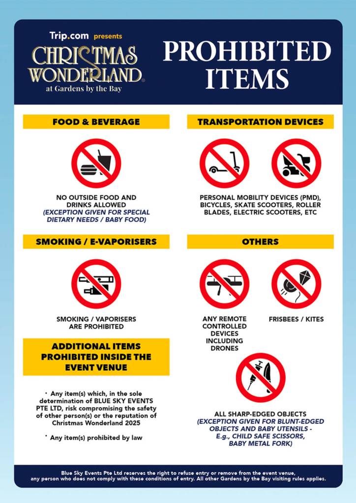 Outside food and beverages are generally not allowed to be brought into Christmas Wonderland. However, visitors may bring in their filled reusable water bottles into the event grounds.